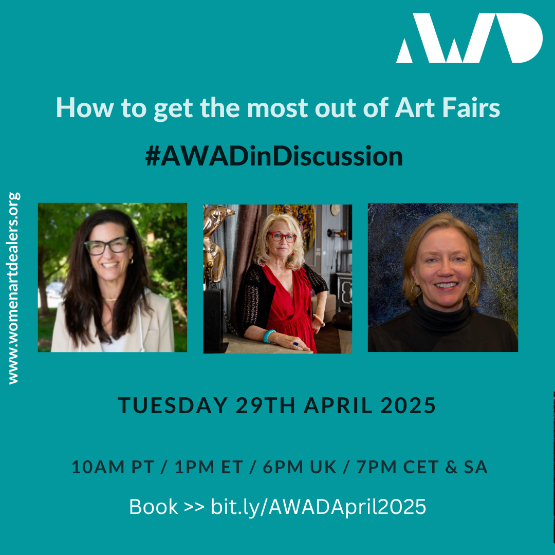 Our online #AWADinDiscussion will consider how you can get the most out of art fairs. Susan Mumford, AWAD Founder & CEO, will be talking to Robinson Holloway, founder and director of Art Fair 14C; Ann Clark Priftis will represent the appraiser the point of view and Cynthia Valianti Corbett, of the Cynthia Corbett Gallery, will share her experiences and opinions as a seasoned art fair exhibitor. This event is free for AWAD Members, Friends and Partners and $10 for guests. Tickets are available via Eventbrite at https://bit.ly/AWADApril2025.