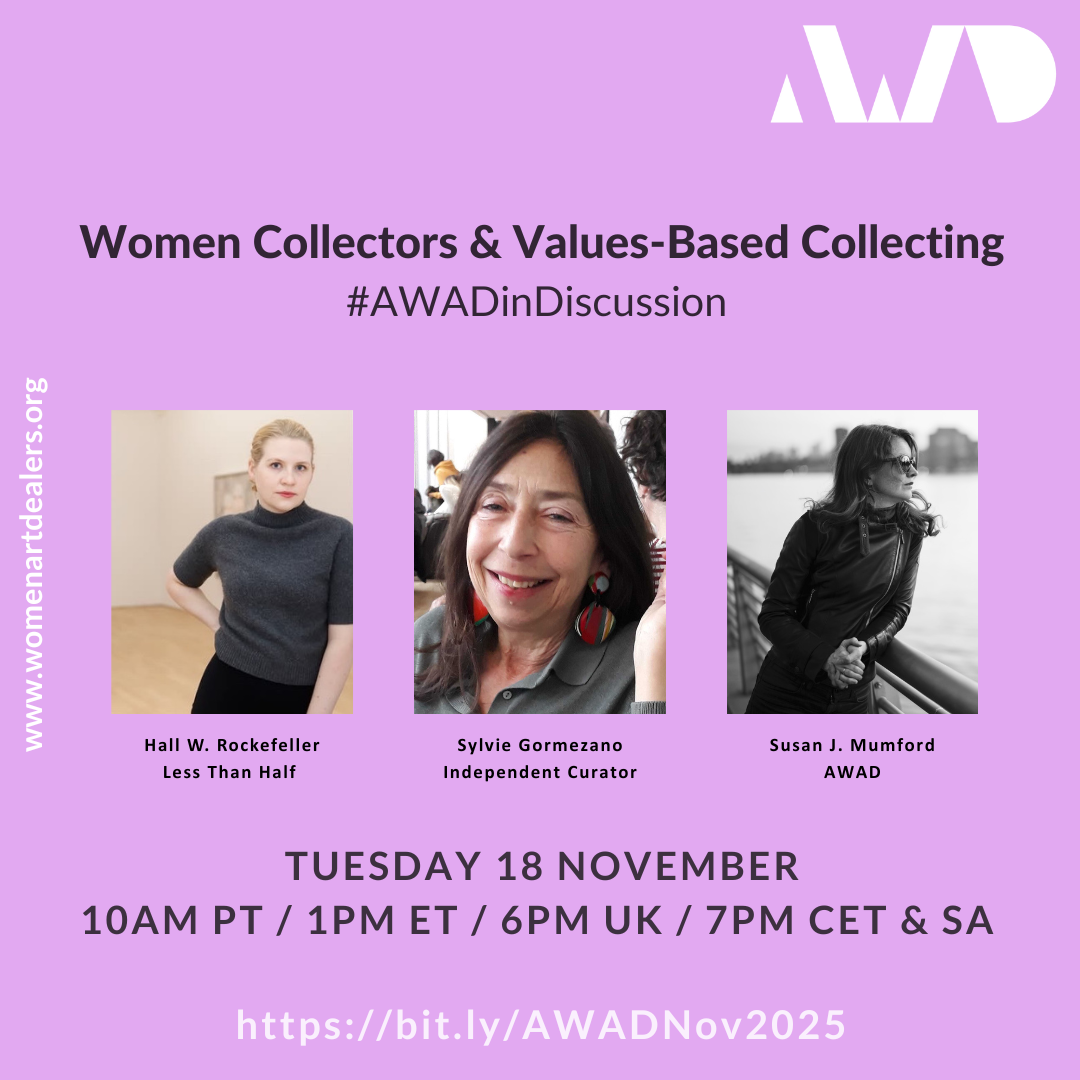 This online #AWADinDiscussion on Tuesday 18th November 2025 will address "How to engage Women Collectors and encourage Values-based collecting." The event is free for AWAD Members, Partners & Friends, guests $10 USD (tickets are available via Eventbrite at https://bit.ly/AWADNov2025)