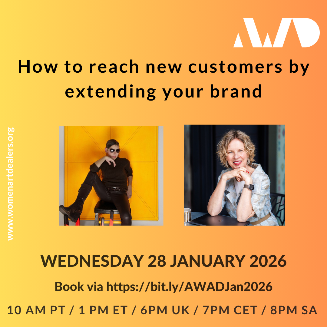 On Wednesday 28th January 2026, AWAD Members Ivy Brown (Ivy Brown Gallery, NY) and Elaine Dye (Byre Gallery, UK) will join AWAD Founder & CEO, Susan Mumford to discuss "How to reach new customers by extending your brand: going beyond social media and email marketing." Tickets are on sale via Eventbrite at https://bit.ly/AWADJan2026.